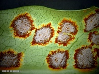 Article: Gadgil, P.D. (in association with Dick, M.A.; Hood, I.A.; Pennycook, S.R.) (2005). Fungi on trees and shrubs in New Zealand. Fungi of New Zealand. Ngā Harore o Aotearoa 4: xi + 437 p. Hong Kong: Fungal Diversity Press. Description: Type: Rust and Smut Fungi; Description: Only the telial stage is known. Telia crowded, minute, black, powdery, up to 1 mm in diameter, associated with circular or elliptical dark brown to black leaf spots, up to 1 cm in diameter; on the lower surfaces of leaves, but spots eventually appearing on the upper surface. Teliospores elongate-oblong, 1-septate, 36–50 × 16–24 μm, brown; pedicel persistent. Distribution: Distribution: Northland, Auckland, Coromandel, Bay of Plenty, Taranaki, Taupo, Rangitikei, Wanganui, Wellington, Hawkes Bay, Wairarapa, Nelson, Buller, Westland, Marlborough Sounds, North Canterbury, Mid Canterbury, Mackenzie, Otago Lakes, Central Otago, Southland, Stewart Island.; 1st Record: Cooke (1890a).
